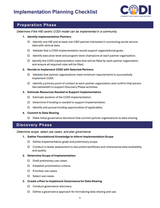 The purpose of this playbook is to support communities interested in connecting data from community settings (e.g., data about community-based programs and services that address needs like food insecurity, transportation, and housing) with clinical data from healthcare providers. The CODI HIE-centric Model helps communities leverage the capabilities of a HIE, including its existing infrastructure and governance to connect clinical and community data. This playbook can be used to support planning a CODI HIE-centric Model Implementation.