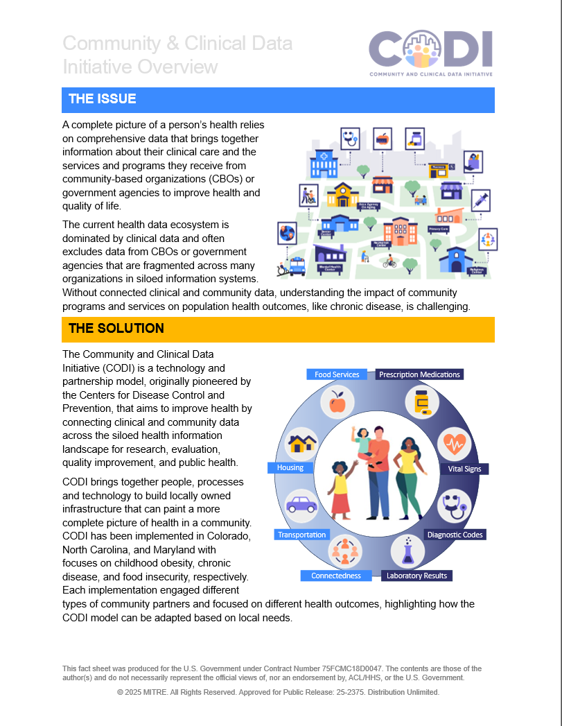 The CODI Overview Fact Sheet is a communications resource that describes the CODI model, outlines the issue that CODI is designed to address, and discusses the potential impact of CODI and the two technical approaches. Implementers may use this fact sheet to engage potential partners in early discussions about implementing CODI to address similar needs.