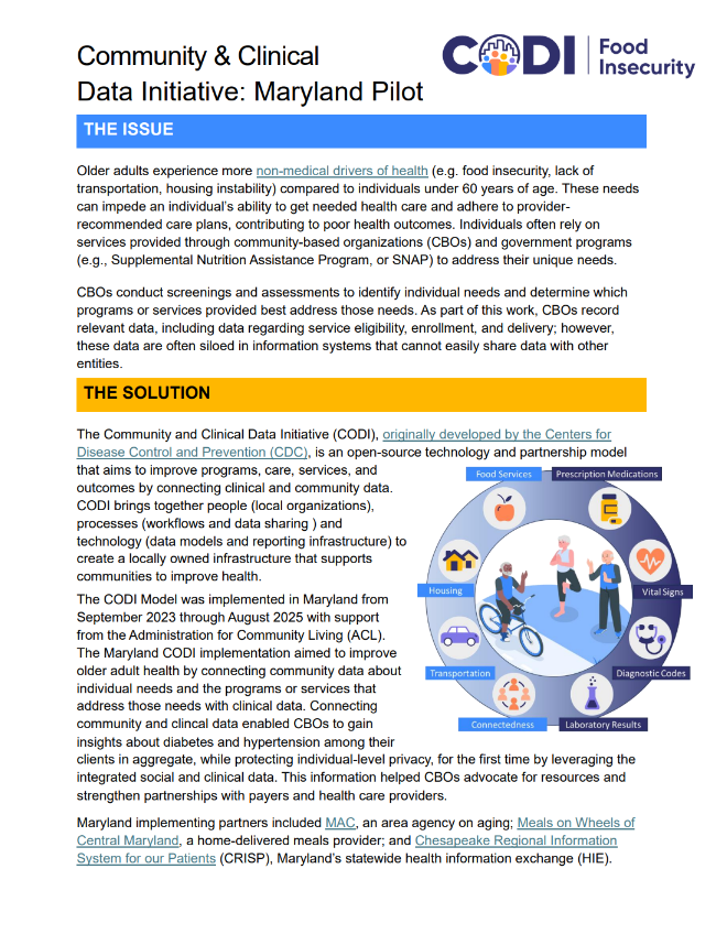 The Maryland Pilot Overview Fact Sheet is an educational resource that describes the issue addressed by the CODI model, and a high-level description of the CODI implementation in Maryland, including the HIE-centric approach. Implementers may use this fact sheet to engage potential partners in early discussions about implementing CODI to address similar needs.